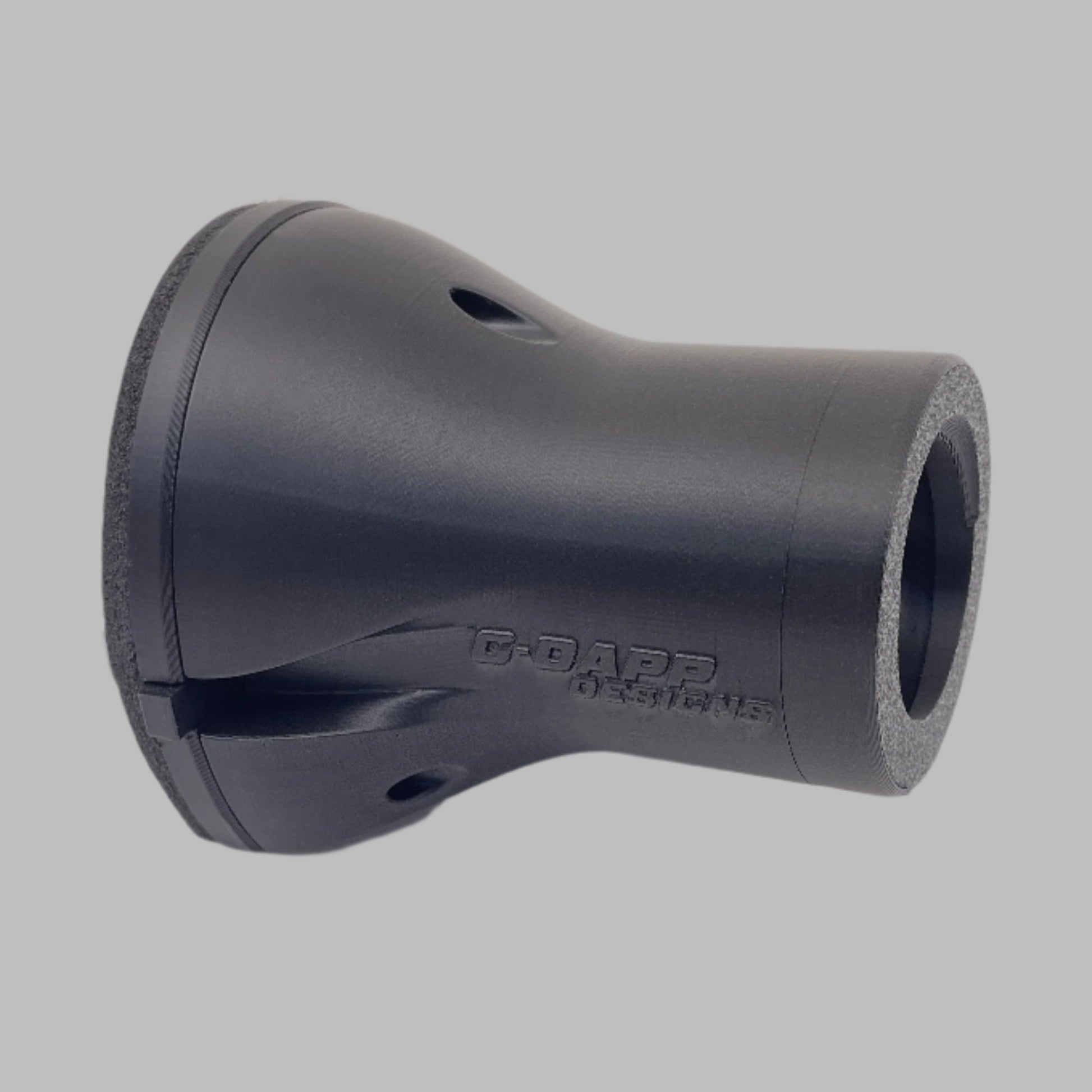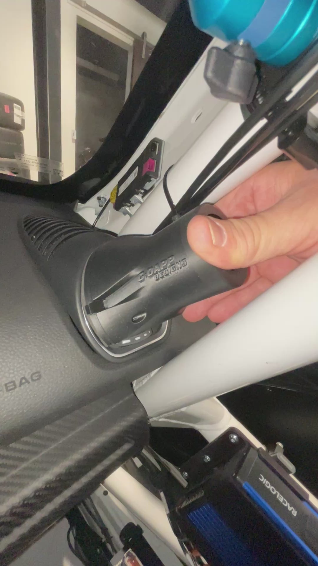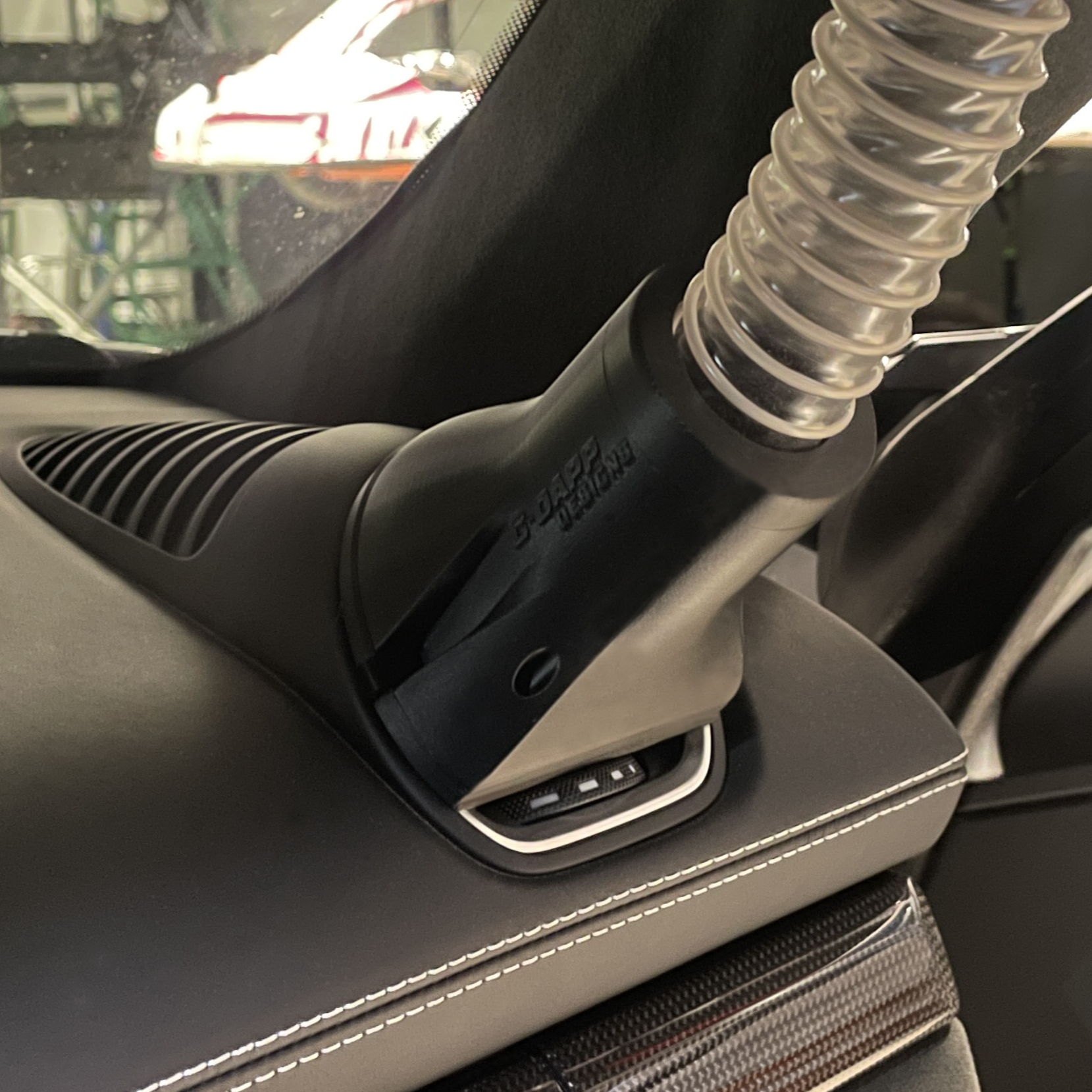 Enhance your track driving experience with the G-Dapp Designs HX3 Cayman GT4 AC Clip In Dash Duct—an innovative 3D-printed solution that clips into the car's dash vent and channels cool air directly to your helmet. This duct is specifically designed for use with a 1.25" helmet hose (SOLD SEPARATELY) that threads securely into its opening.